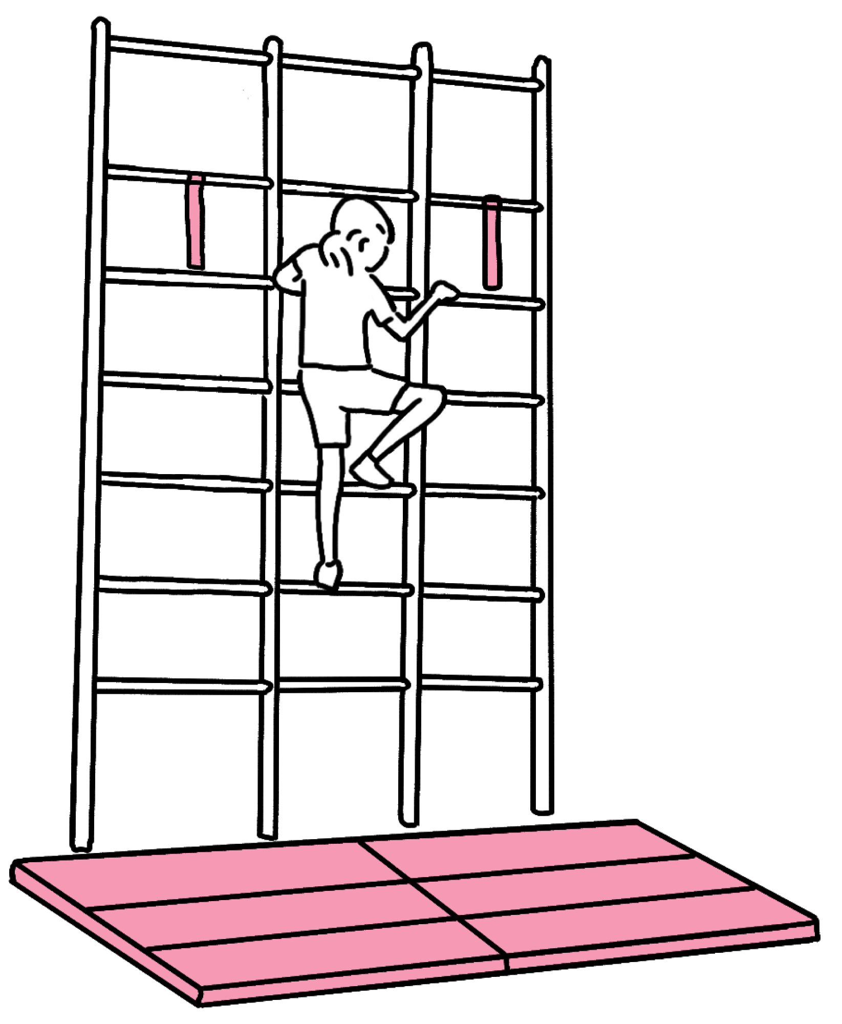 Klauter door verticaal en horizontaal opgehangen hoepels