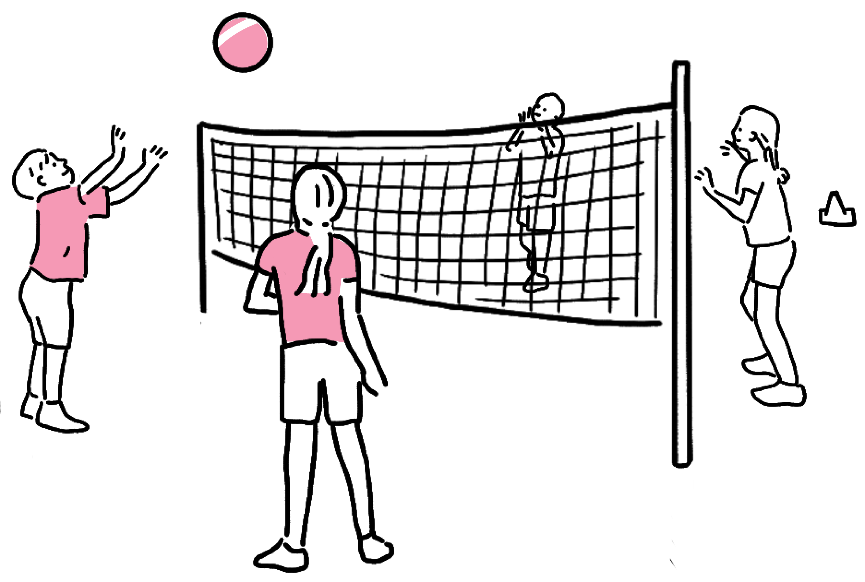 Maak twee tweetallen. Gooi de bal onderhands over het net. Eén kind van de andere partij probeert de bal te vangen en gooit deze weer terug over het net.