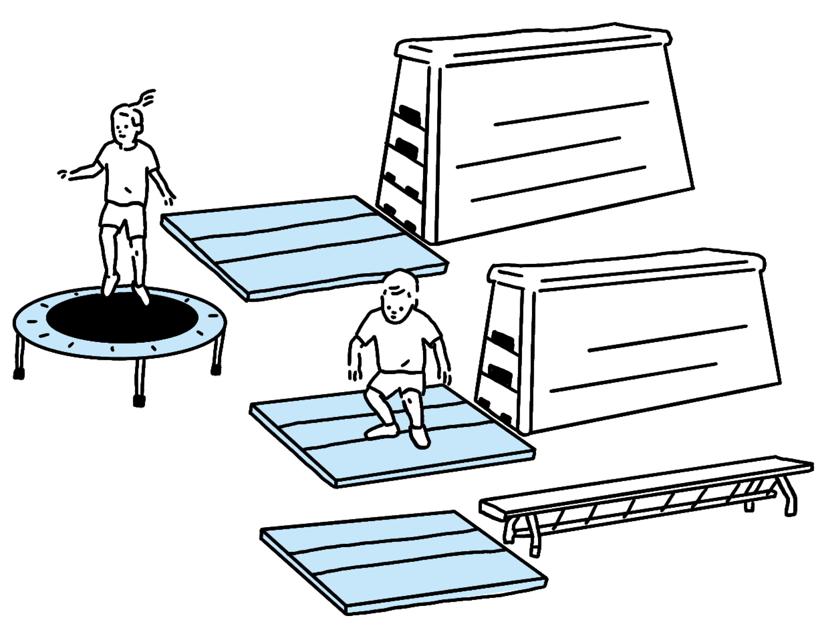 Spring van de kasten en bank af. Spring 10 keer op de trampoline.