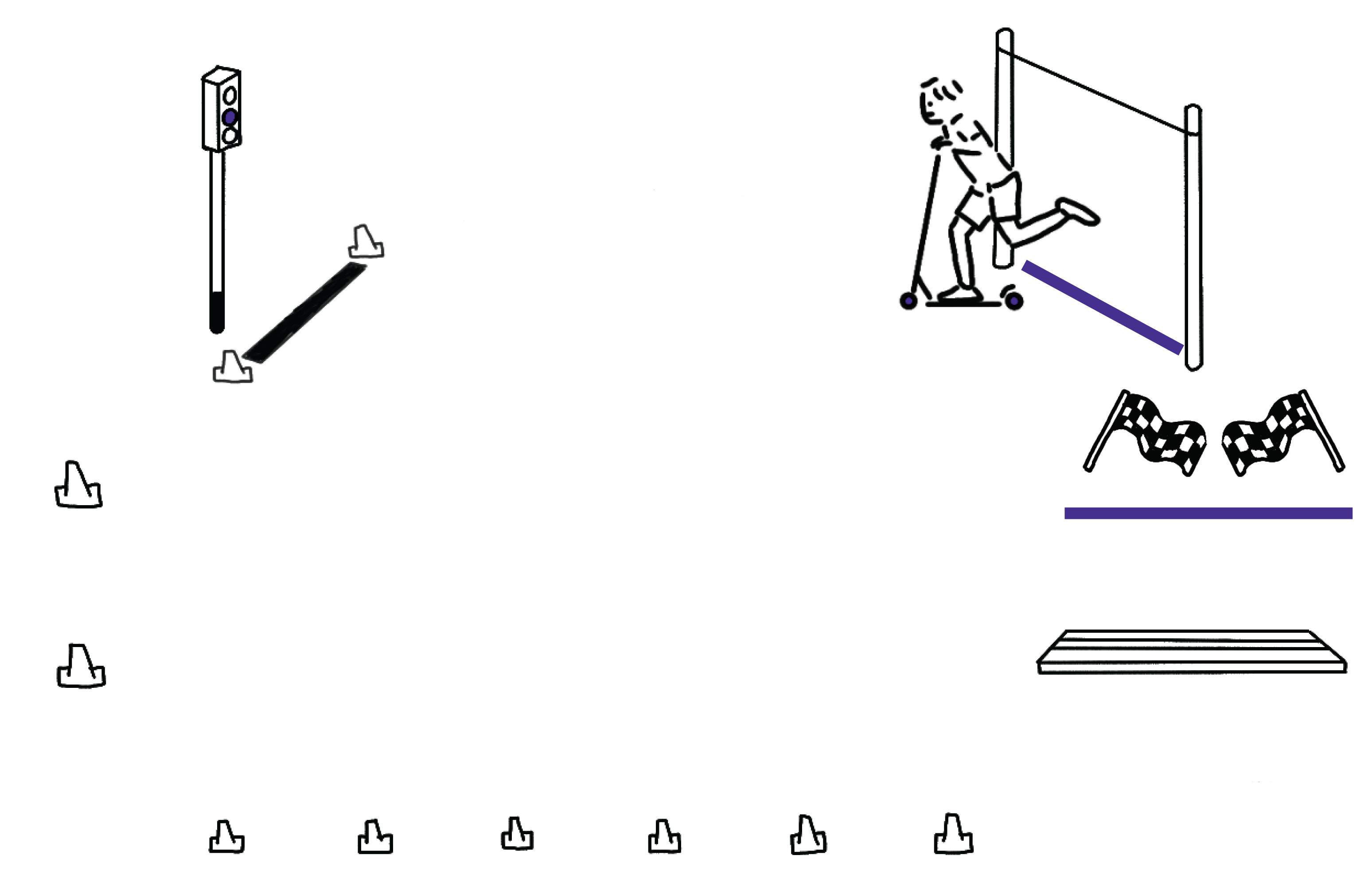 Zoek een rustig pleintje. Gebruik een klimrek als start. Een prullenbak als stoplicht. Bidons als S-bocht en slalom. Twee jassen als finish.